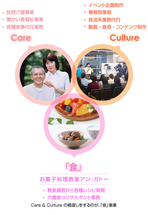 | そしてCare & Cultureをつなぐもの、まさに命の素の食を通してみなさまの「暮らしぶり」をより一層健康で豊かなものにしていくお手伝い | |||||